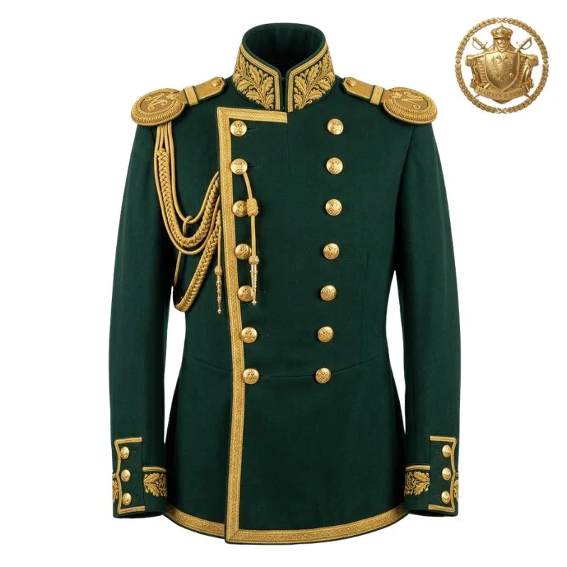 Handcrafted green military tunic with intricate gold embroidery, epaulettes, and aiguillette for an authentic officer look.