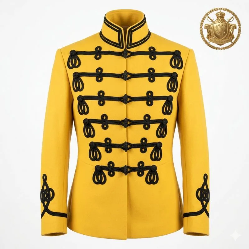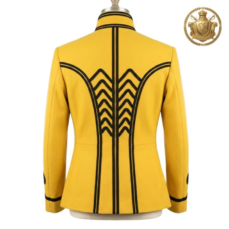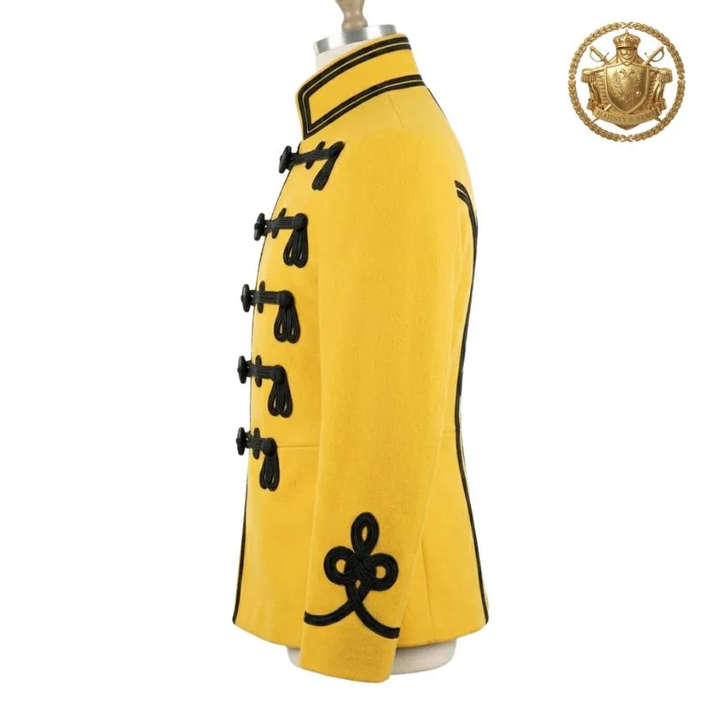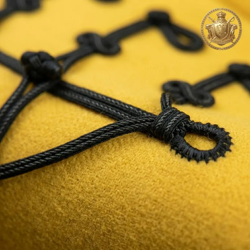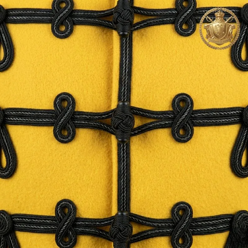 Bold yellow military hussar jacket featuring intricate black braid detailing for a striking ceremonial look.